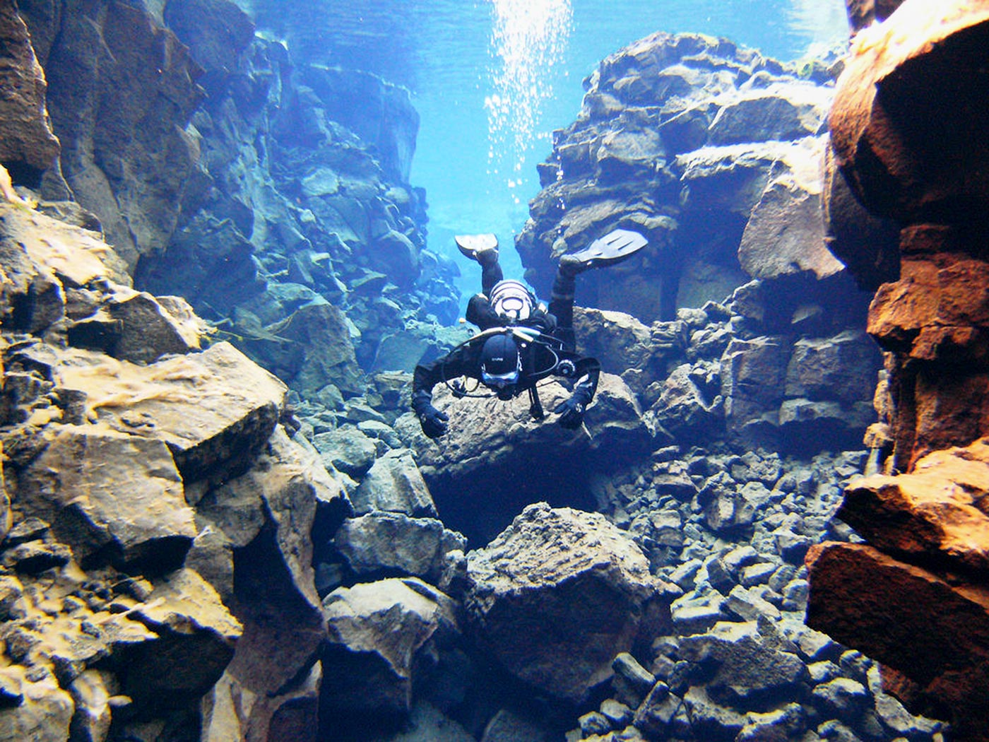 Zu den beliebtesten Aktivitäten in Thingvellir gehören das Tauchen und Schnorcheln. Das können Sie hauptsächlich im Tal des Parks tun, wo sich die Grenze der tektonischen Platten befindet. Dieses Gebiet zeichnet sich durch dramatische Felsformationen, Tümpel und Flüsse aus. Das Highlight ist die Almannagjá-Spalte, durch die der Fluss Öxará fließt. An der Südspitze dieses Flusses liegt die Silfra-Schlucht, eines der einzigartigsten Tauchgebiete der Welt. In dieser Schlucht schwimmen Sie zwischen zwei tektonischen Platten. Das Wasser ist so klar, dass man bis zu 100 Meter tief sehen und die bunte Unterwasserwelt bewundern kann.