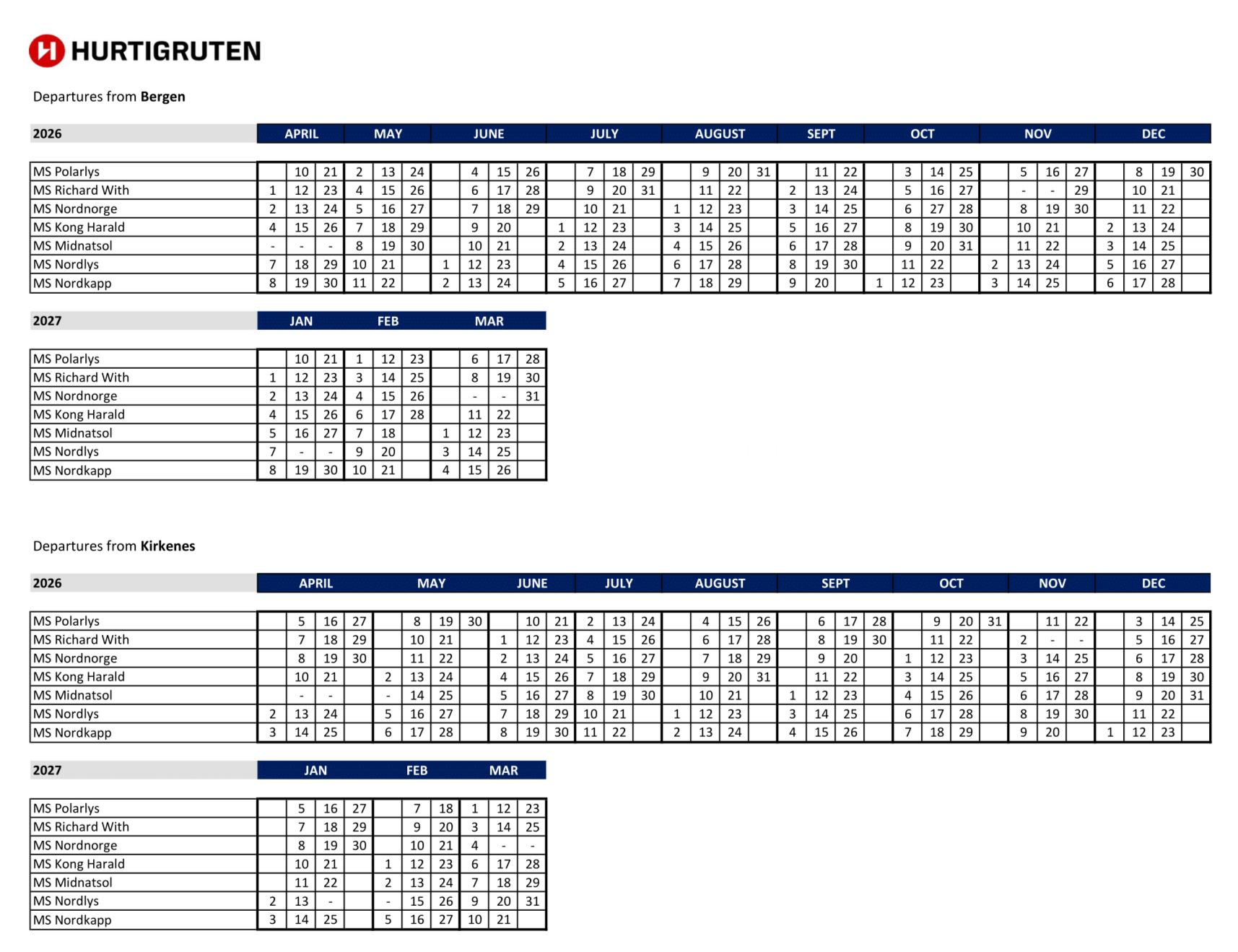 Das ganze Jahr über legt mehrmals pro Woche ein Hurtigruten-Schiff zu einer Rundreise entlang der norwegischen Küste ab. Es kann vorkommen, dass Schiffe aufgrund technischer Wartungsarbeiten vorübergehend aus dem Verkehr gezogen werden müssen. Änderungen im untenstehenden Fahrplan sind jederzeit vorbehalten.