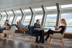 Auf dem großen Außendeck können Sie den Blick in die Ferne schweifen lassen. Ideal, um während der Fahrt die Umgebung zu genießen. Im Winter können Sie hier den Blick gen Himmel richten und Ausschau nach dem magischen Nordlicht halten. Im Fitnessraum können Sie mit Panoramablick ins Schwitzen kommen. Lust auf Entspannung? Dann direkt ab in die Sauna oder in den Massage-Raum. Auch hier genießen Sie eine wunderschöne Aussicht!