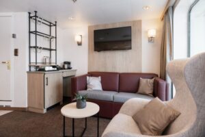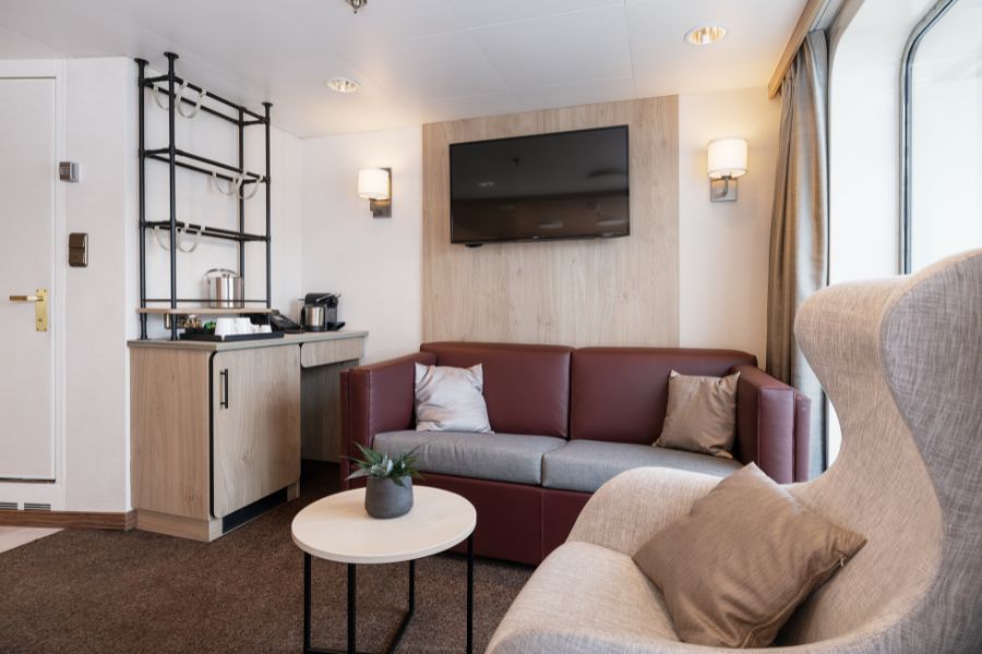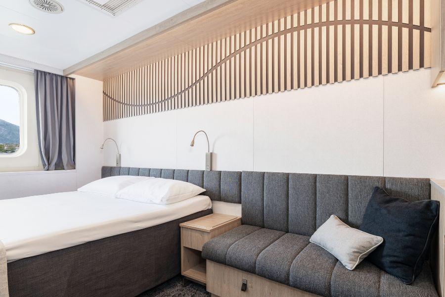 An Bord können Sie in verschiedenen Kabinen übernachten, die sich in Größe und Komfort unterscheiden. Die Arctic Superior Doppelzimmer verfügen über ein Fenster, von dem aus Sie eine tolle Aussicht genießen können. Es stehen aber auch Standard-Innenkabinen und Außenkabinen zur Verfügung. Die meisten Außenkabinen haben ein Fenster oder ein Bullauge, einige davon mit eingeschränkter Sicht. Für welche Kabine Sie sich auch entscheiden, alle verfügen über ein eigenes Bad. Sie wünschen etwas mehr Luxus? Dann wählen Sie eine der Suiten auf den oberen Decks (19 – 29 m²). Diese stilvoll eingerichteten Zimmer verfügen neben einem luxuriösen Doppelbett auch über eine eigene Sitzecke. Darüber hinaus stehen auch Mini-Suiten zur Verfügung.