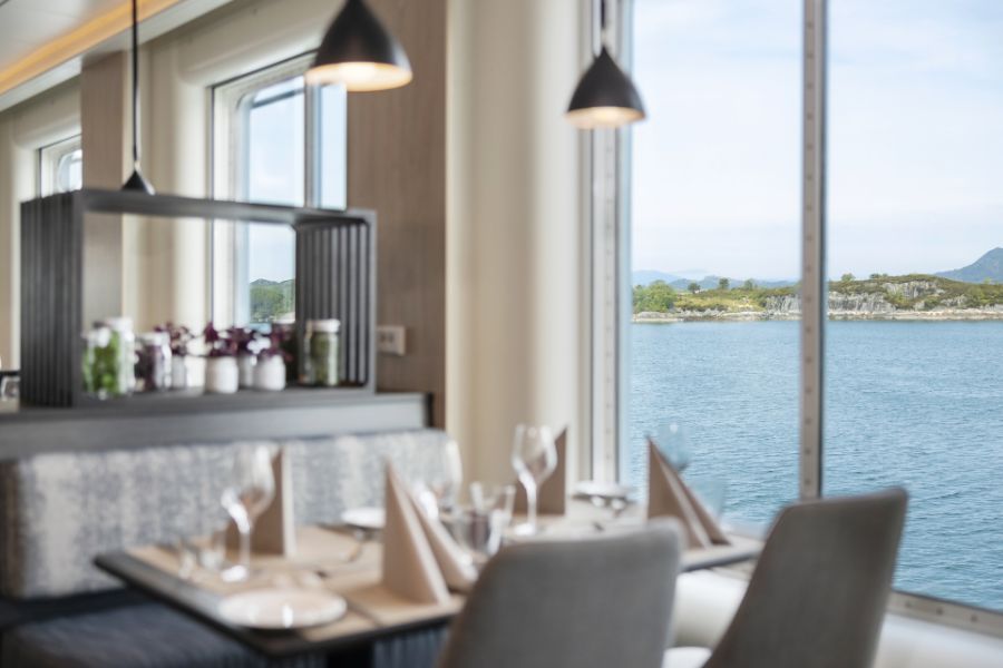 Die heutige MS Finnmarken, früher bekannt als MS Otto Sverdrup, wurde 2002 gebaut und 2020 renoviert mit natürlichen Materialien wie Granit, Eiche und norwegischer Wolle. So entsteht eine Atmosphäre, die zugleich skandinavisch modern und gemütlich ist. Ein technisches Update im Jahr 2025 macht das Schiff nicht nur komfortabler, sondern auch nachhaltiger – als Hybrid-Schiff mit Batterieantrieb und Landstromanschluss.