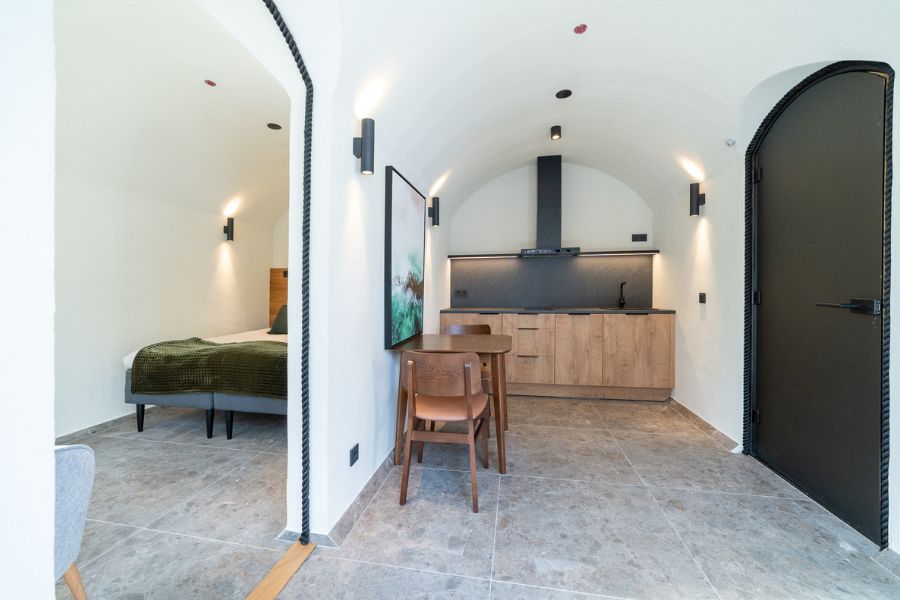 Die Hütten am Hang rund um das Hauptgebäude sind keine gewöhnlichen Chalets. Hier schlafen Sie in eine der 80 exklusiven Gámme-Cabins – traditionelle, von den Sami inspirierte Hütten mit Grasdach. In der samischen Sprache bedeutet das Wort „mit Torf bedeckte Hütte“. Jede Cabin verfügt über eine eigene Sauna im Badezimmer und ist für zwei Erwachsene konzipiert. Eine Sitzgruppe, Minibar und Wasserkocher sorgen für zusätzlichen Komfort. Für Familien gibt es auf Anfrage Cabins mit einer zusätzlichen Schlafmöglichkeit (Bett/Schlafsofa) für ein Kind.